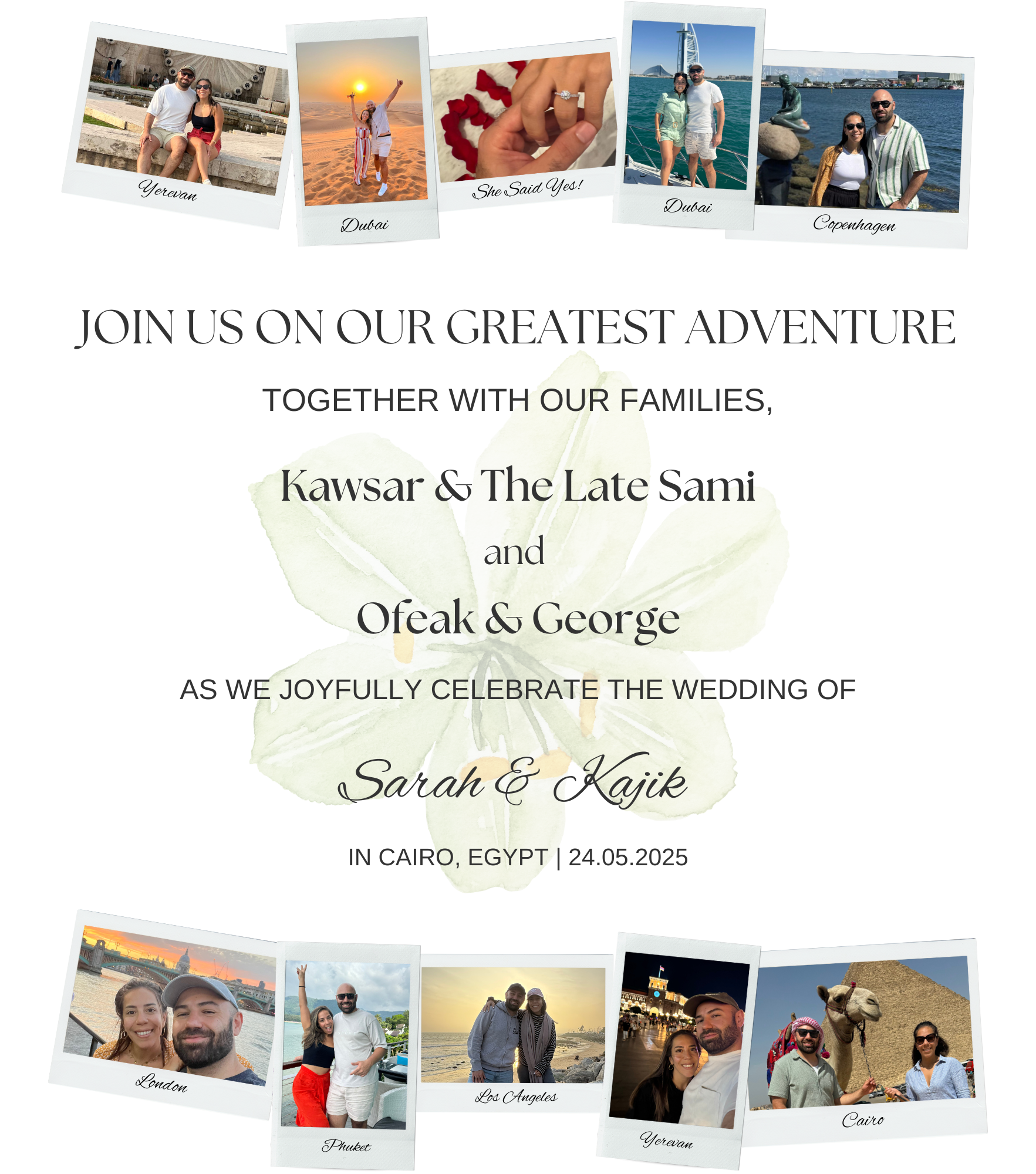 For any booking inquiries, please email Nader and mention that you are attending Sarah & Kajik’s wedding on 24th May, 2025.
